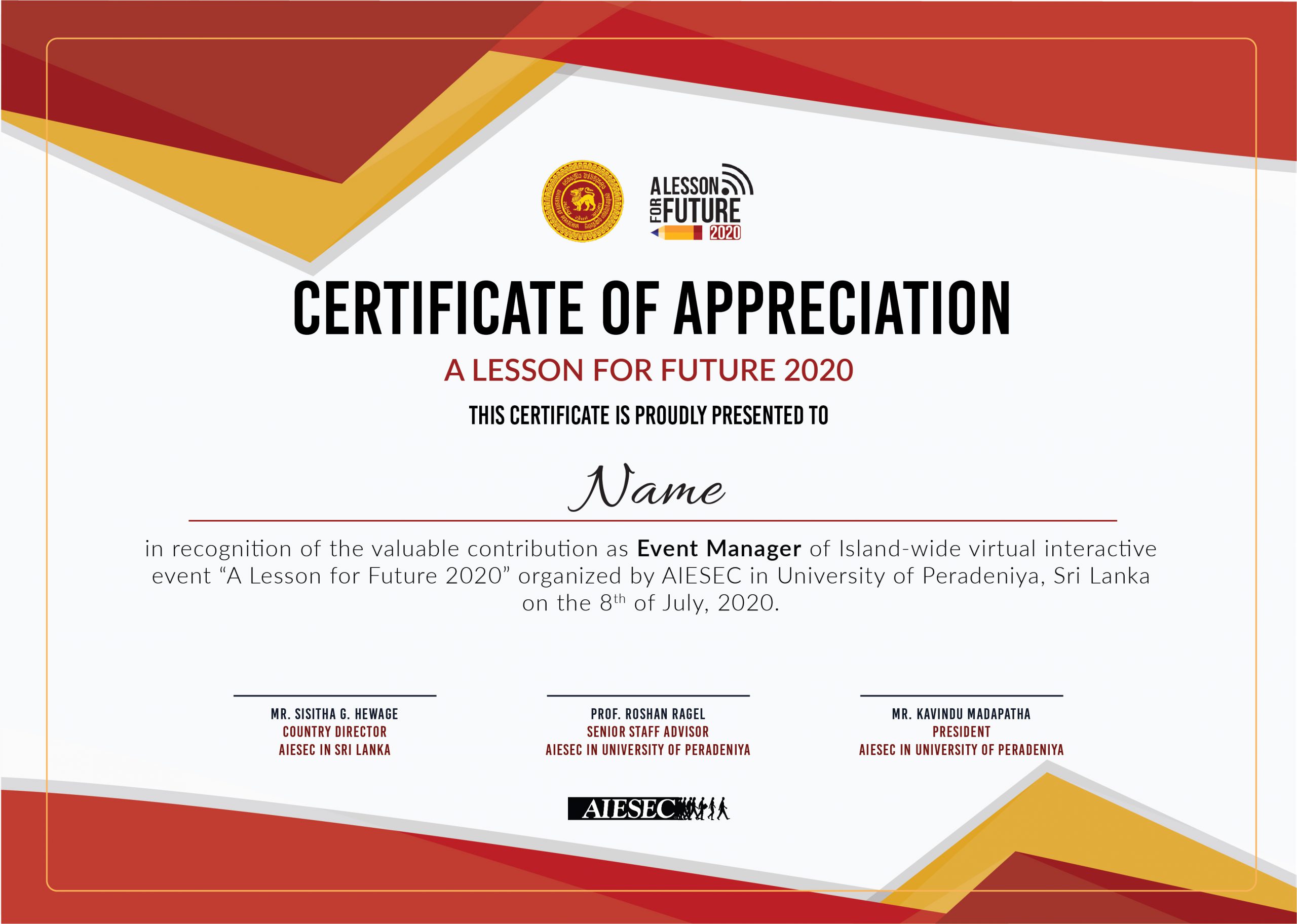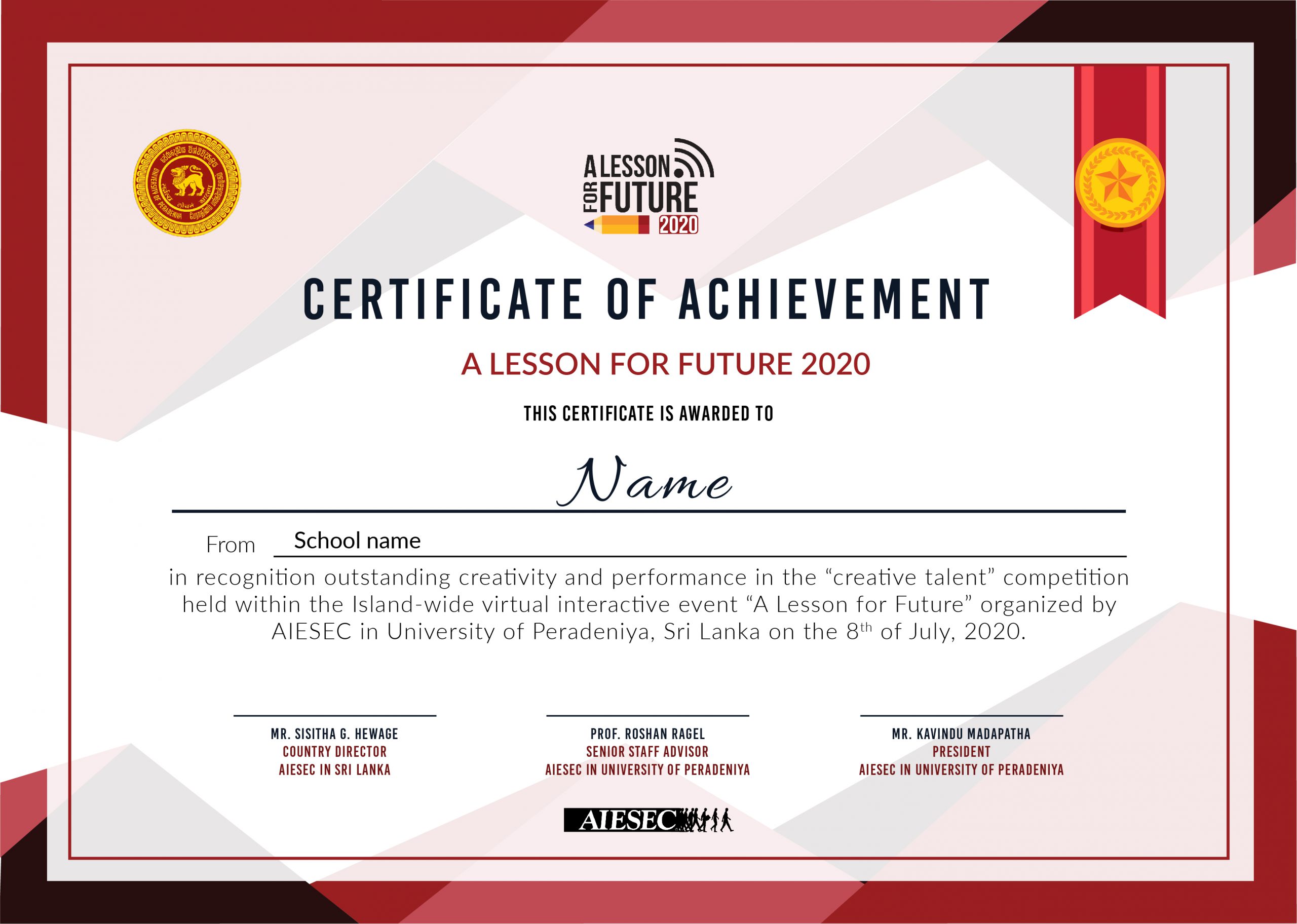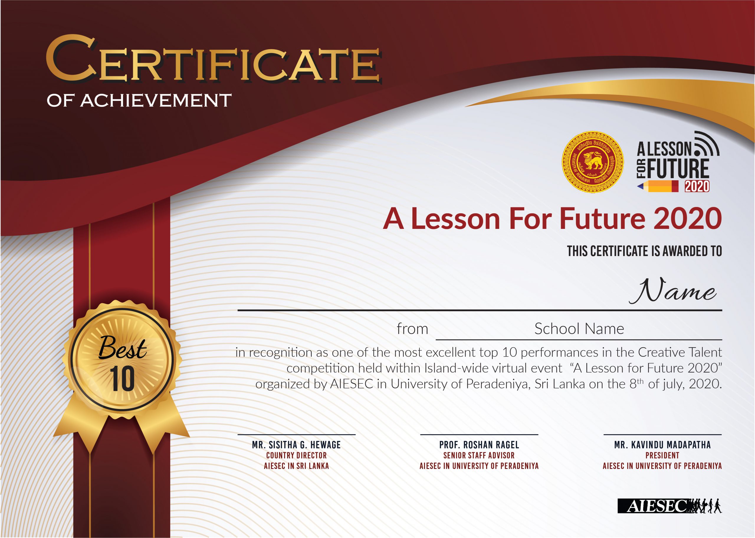 “A Lesson For Future” was inaugurated in 2020 by AIESEC in Kandy to provide something to younger generations in the crisis that occurred in 2020 due to the Covid19 pandemic. A small idea was made into a huge project due to the effort of many individuals, which, in the end, the whole Sri Lankan school community had the fruits of this event.